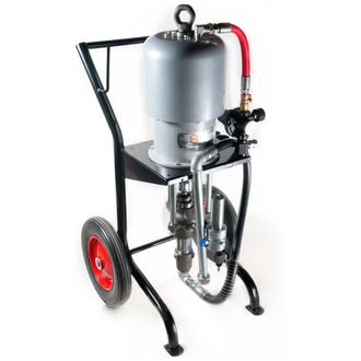 В окрасочный агрегат поступает воздух от компрессора или пневматической сети, (для покраски аппаратом требуется от 2-8 бар, до 1500 л/мин воздуха). Краска в аппарат засасывается из ведра, в котором та поставляется, на входе во всасывающий патрубок надет фильтр от грубых примесей в краску. За счет разницы площадей верхней и нижней части насоса в 68 раз (передаточное соотношение 68:1) нагнетается давление на краску, т.е подавая 2 атм воздуха , мы получаем 132 атм краски, 3 атм воздуха - 194 атм краски, и тд. Краска на выходе из агрегата фильтруется через фильтр тонкой очистки и попадает в шланг для подачи на безвоздушный краскопульт. Краска на выходе из краскопульта распыляется через сопло тонкого сечения, образуя при этом четко очерченный факел.